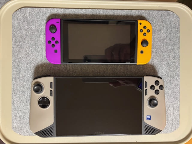 Switchとの比較です。まだSwitch2を手に入れることができておりませんので、通常Switchとの比較になります。8インチ画面なのでSwitch2と同じくらいの大きさっぽいですね。