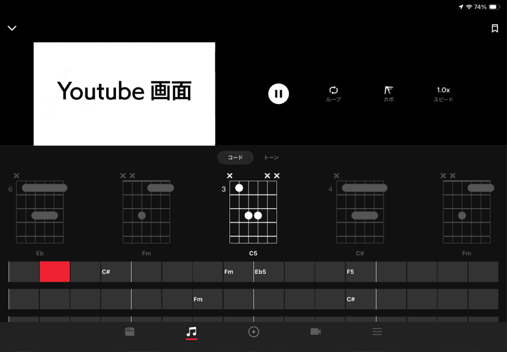 ギターやベースは音楽に合わせて練習することが多いと思いますが、このアプリはYoutubeと連携することが可能でして、Youtubeの項目にて任意の動画を流すと、なんとAIが自動でコードを生成してくれるのです。